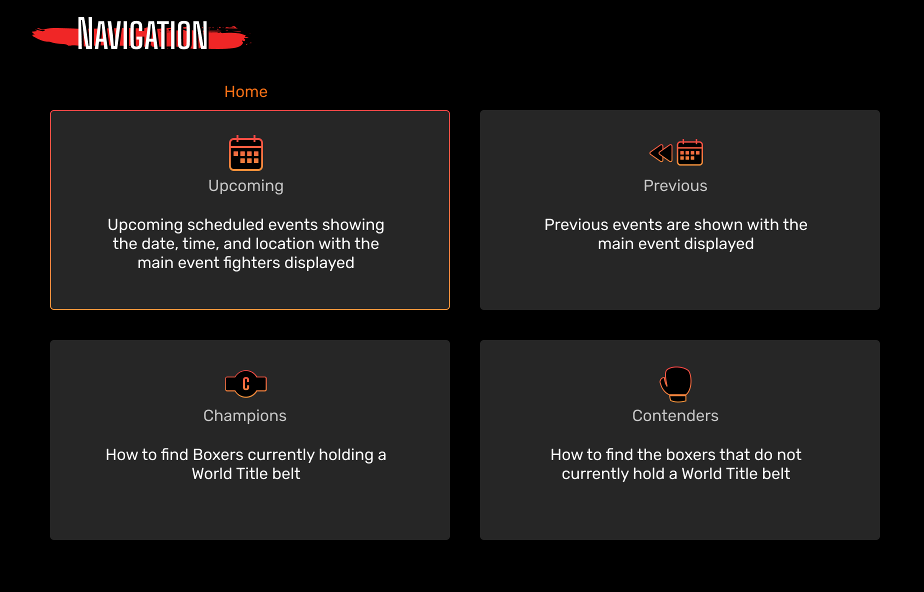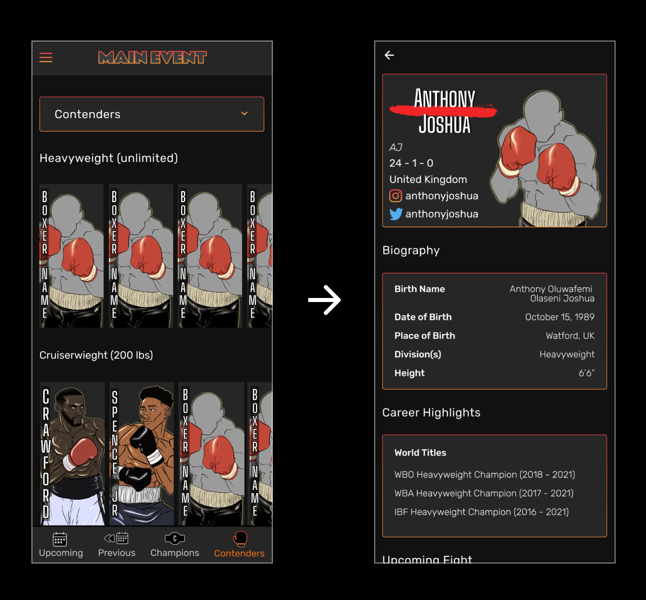 Fighter Profiles: A section that has more information on the individual fighter. Could be base stats like height and reach, include a list of previous fights to see how they’ve done in the past. Any upcoming events that they are involved in would be listed as well.